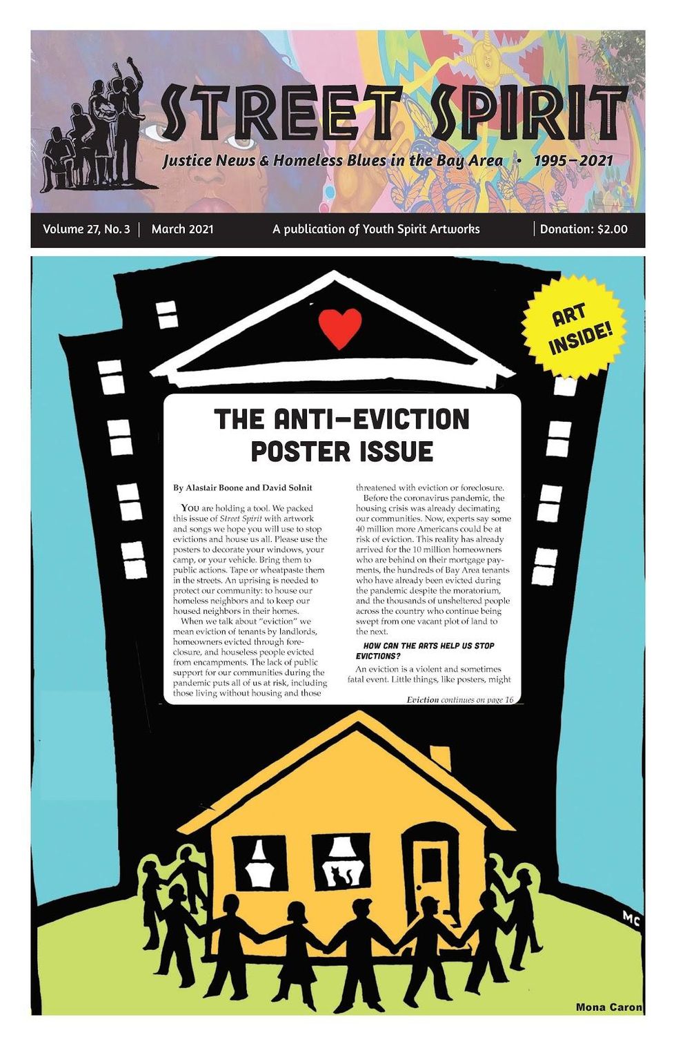 This issue of Street Spirit came about after Editor Alastair Boone invited East Bay Area arts organizer David Solnit to contribute artwork. David, a longtime fan of and occasional contributor to Street Spirit, had been making lots of signs, flags, banners, puppets, and even a coffin to support tenants organizing against COVID-19 evictions. David asked, "What about including a bunch of giant, beautiful posters that could be used to help stop evictions--and songs, too?" Alastair had been wanting to do a poster edition, so was quick to say yes. She then invited David to guest co-edit this special Anti-Eviction Arts Edition you hold in your hands.