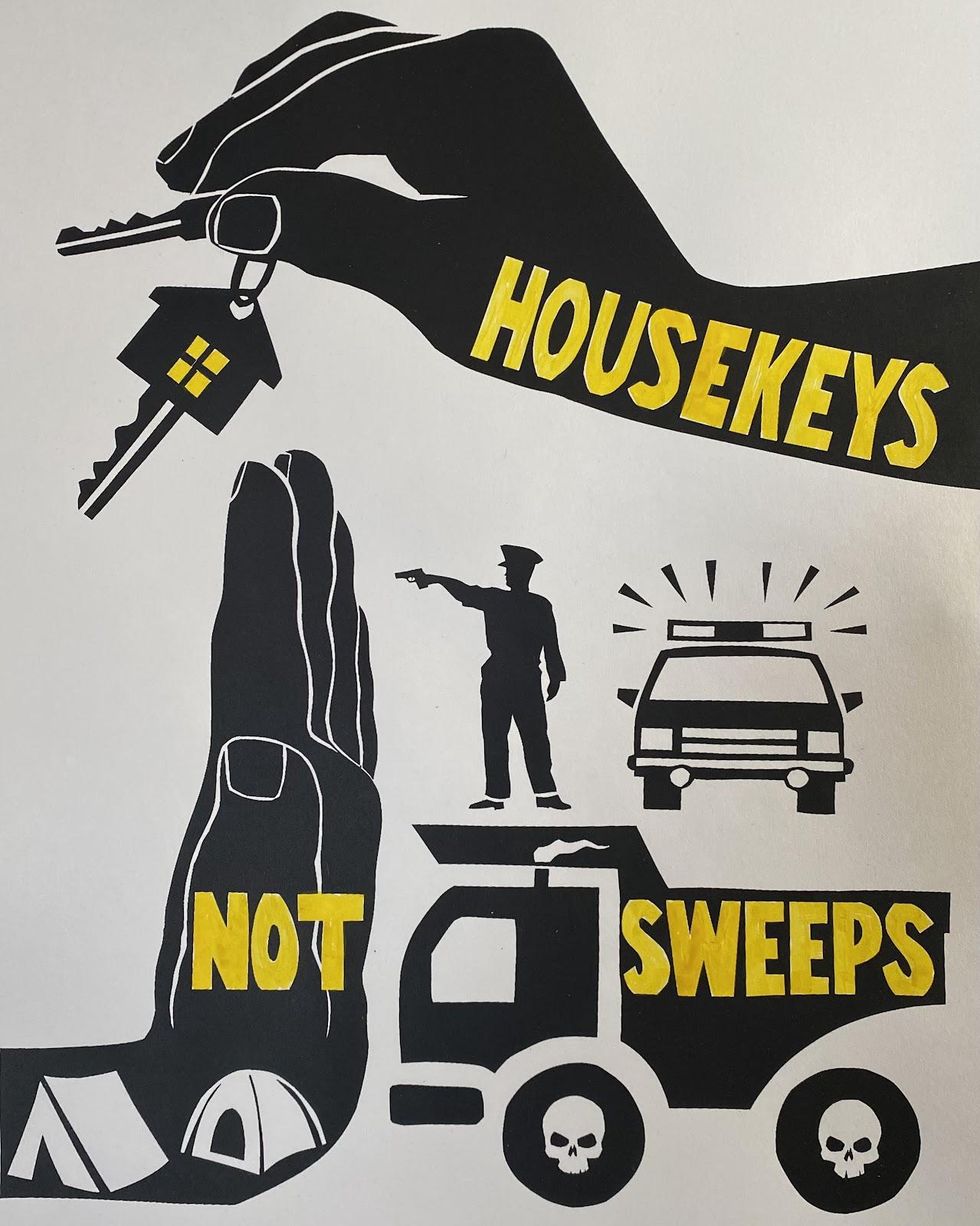 You are holding a tool. We packed this issue of Street Spirit with artwork and songs we hope you will use to stop evictions and house us all. Please use the posters to decorate your windows, your camp, or your vehicle. Bring them to public actions. Tape or wheat paste them in the streets. An uprising is needed to protect our community: to house our homeless neighbors and to keep our housed neighbors in their homes.