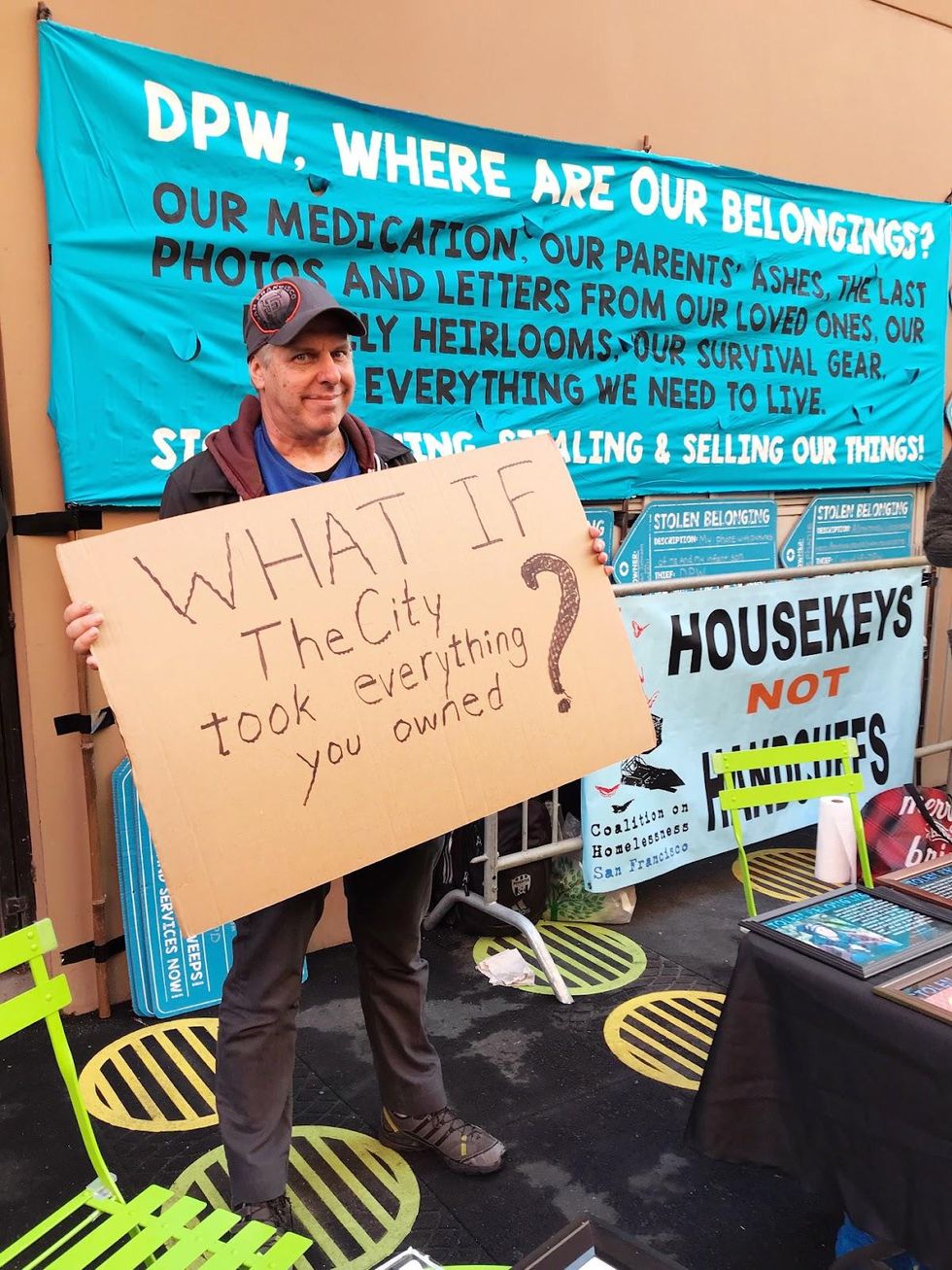 The Stolen Belonging project brought together--in the words of the project website stolenbelonging.org--"houseless residents, housing justice advocates, human rights lawyers and 'housies' who want to hold the city accountable for the ongoing theft and violence against those who currently have no roof." They organized a "Stolen Belonging" creative action/event that "featured art and written stories gathered by our team over the last seven months, spoken word, and music by Brass Liberation Orchestra. Our main initiative, however, will be supporting and witnessing unhoused folks in their efforts to retrieve possessions taken in the sweeps, which, as SF city policy states, should be bagged, tagged and stored at the DPW yard for 90 days."