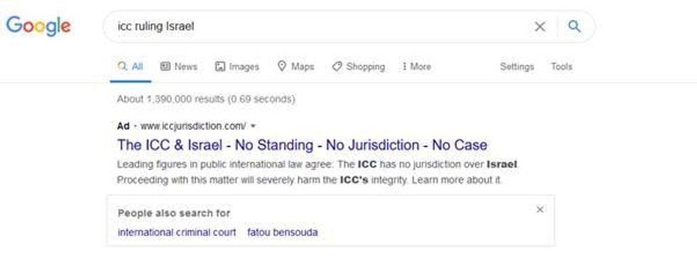 The ICC is on Israel's target list. This becomes clear when searching for the terms "ICC ruling" and "Israel" together; instantaneously, an ad pops up at the very top of Google's list of 1,390,000 results: "ICC & Israel: No Standing. No Jurisdiction. No Case." Clicking the ad, will take you to a slick blue and white website (i.e., the colour of Israel's flag) called "ICC Jurisdiction" with the large "No Standing...." slogan at the centre of the page.