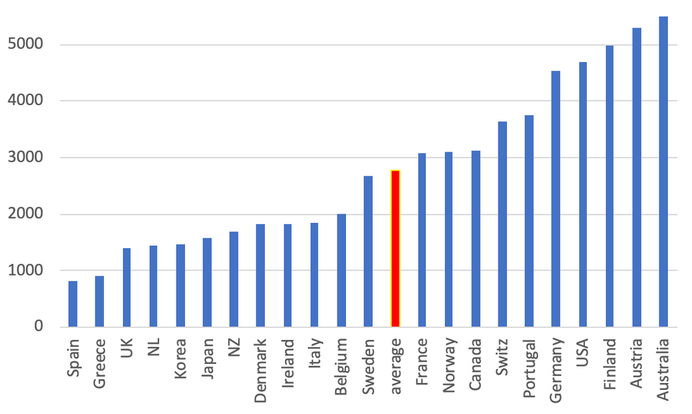 Cumulative public relief spending to cushion the negative impacts of the health emergency for households and vulnerable businesses (recorded until January 2021) varies EUR815 per person in Spain and EUR5490 per capita in Australia (see Figure 5). Average cumulative relief spending is EUR2778 for the 22 OECD economies in the panel. On a per-capita basis, Germany and Finland did spend more than 5 times as much on COVID-19 relief than Greece and Spain, and more than 2 1/2 as much as Italy. Differences in per-capita relief spending are not always due to fiscal constraints, as is shown by Denmark, Korea, and New Zealand which all have below-average per-person relief funding in combination with relatively low COVID-19 death rates.