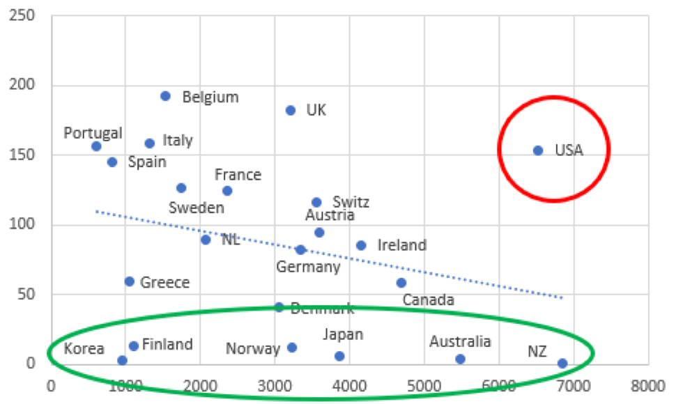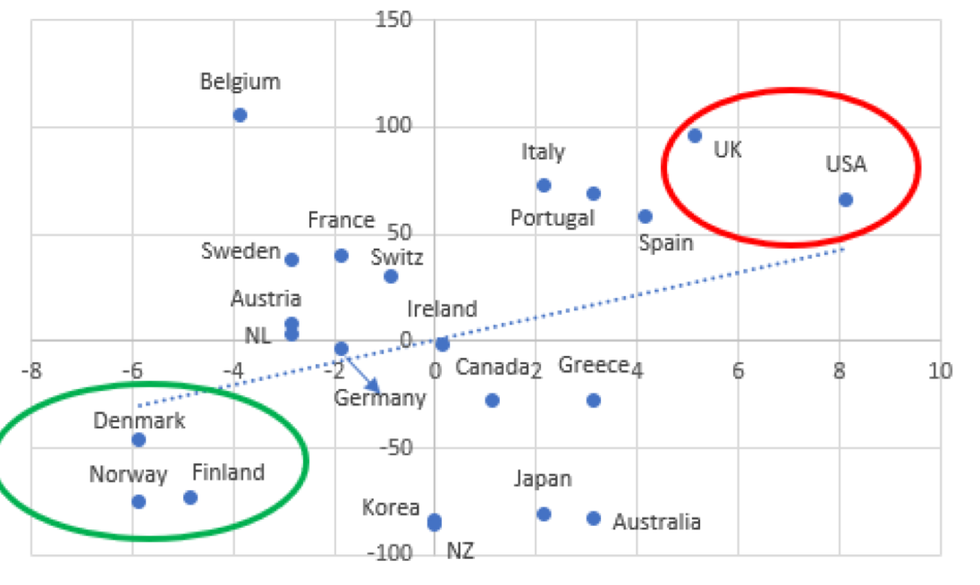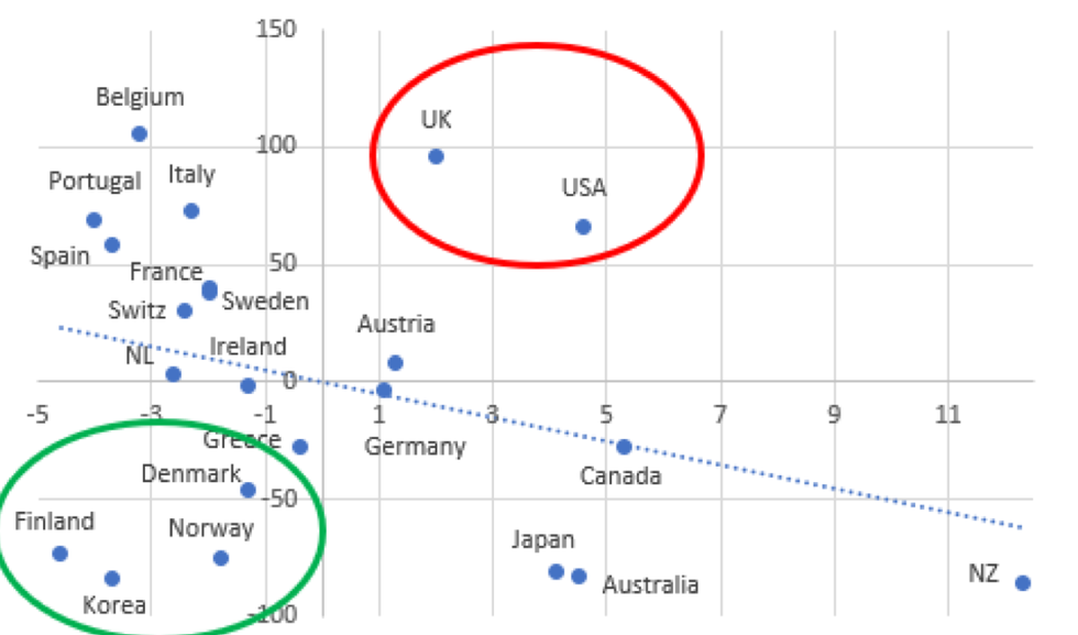 Of interest are those countries which are located far off the regression line. One group, including Denmark, Finland, Norway, and South Korea, experienced significantly below-average COVID-19 mortality while incurring below-average additional spending on relief measures. These countries appear to have managed the health emergency comparatively well (so far) in terms of both public health and public finances (focusing on 'crushing the curve' rather than 'flattening the curve'). The same cannot be said for the other group which includes the U.K. and the U.S. Both Anglo-Saxon economies experienced significantly above-average COVID-19 death rates, despite incurring considerable above-average additional relief expenditures. The Johnson government and the Trump administration thus stand out for their expensive mismanagement of the public health emergency--both in terms of lives and taxpayers' costs (Marmot et al. 2020b; Woolhandler et al. 2021).