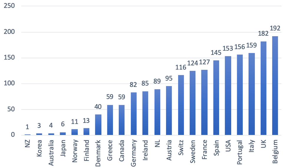 For the world as a whole, cumulative confirmed SARS-CoV-2 mortality amounted to 2,476,526 deaths on February 23rd 2021, which is when the U.S. coronavirus death toll passed the tragic mark of 500,000 fatalities. Out of these 2.48 million confirmed coronavirus deaths worldwide, 1,006,817 deaths, or 43%, occurred in the panel of 22 OECD countries, listed in Figure 1. As is shown in the figure, the relative cumulative mortality impacts of COVID-19 vary greatly between countries--from 0.5 deaths per 100,000 persons in New Zealand to more than 190 deaths per 100,000 persons in Belgium. The U.S. and the U.K. have 149 and 178 deaths per 100,000 persons in their respective populations.
