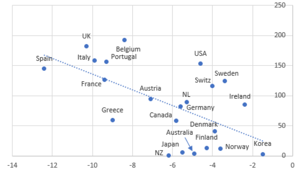 The scatterplot of Figure 2 throws more light on the issue. On the horizontal axis, I measure the difference between additional public spending on COVID-19 relief of each country (as a percentage of GDP and up to January 2021) and the unweighted panel-average of additional relief spending for the 22 OECD countries (which is 7.2% of GDP). On the vertical axis, I measure the difference between COVID-19 deaths per 100,000 population in each country and the (unweighted) panel-average COVID-19 mortality rate, which is equal to 86 deaths per 100,000 population.