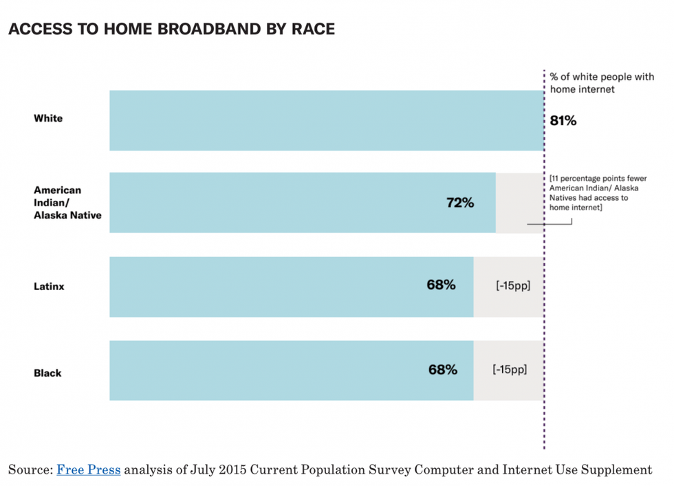 The deepest rift in the digital divide is when it comes to race: Black and Latinx adults are almost twice as likely as white adults to lack broadband access. Due to systemic inequities in education and employment, people who are Black or Latinx have lower average incomes than white people, and for many of these households, a broadband subscription--at an average rate of $68 per month--may simply be unaffordable.