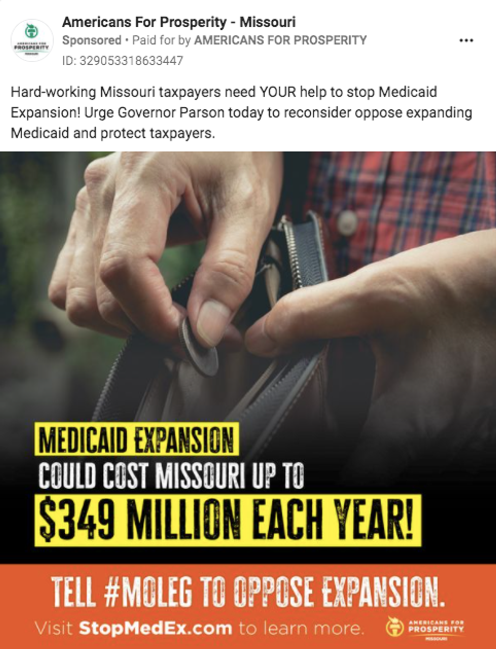 AFP Missouri held town halls in nine cities across the state during the ballot referendum fight, and it paid for Facebook ads opposing the expansion as recently as May 13 of this year.