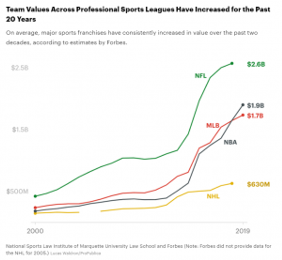 In almost all cases, assets like the goodwill of fans get more valuable over time, not less, which drives the values of sports teams ever higher, as shown in this ProPublica chart:
