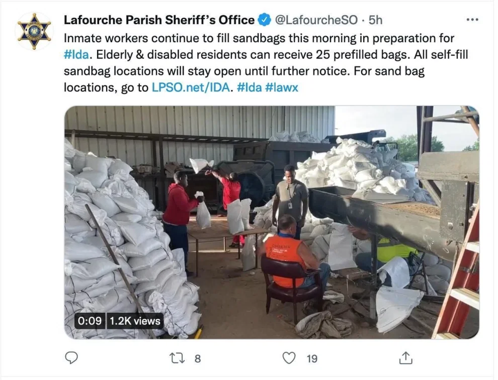 South of New Orleans, LaFourche Parish Sheriff's Department helpfully offered pre-filled sandbags to residents of the overwhelmingly white community, courtesy of free labor by people in jail awaiting trial, posting of bail, or release. Detainees remained in jail even after evacuation orders were issued, despite the barbaric consequences of this practice during Katrina (and more than 3,000 detained people being killed by COVID).