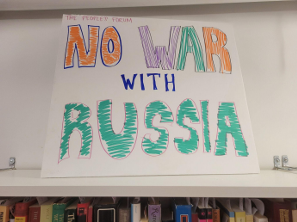 Poster demanding "No War With Russia" propped up on a bookshelf at The People's Forum.