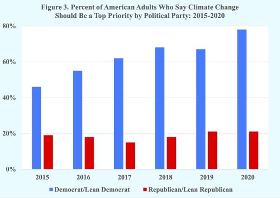 Whereas 78 percent of Democrats said climate change should be a top priority in 2020, 21 percent of Republicans said it should be. Moreover, the gap between them has widened over the past several years, with increasing proportions of Democrats saying climate change should be a top priority (Figure 3).