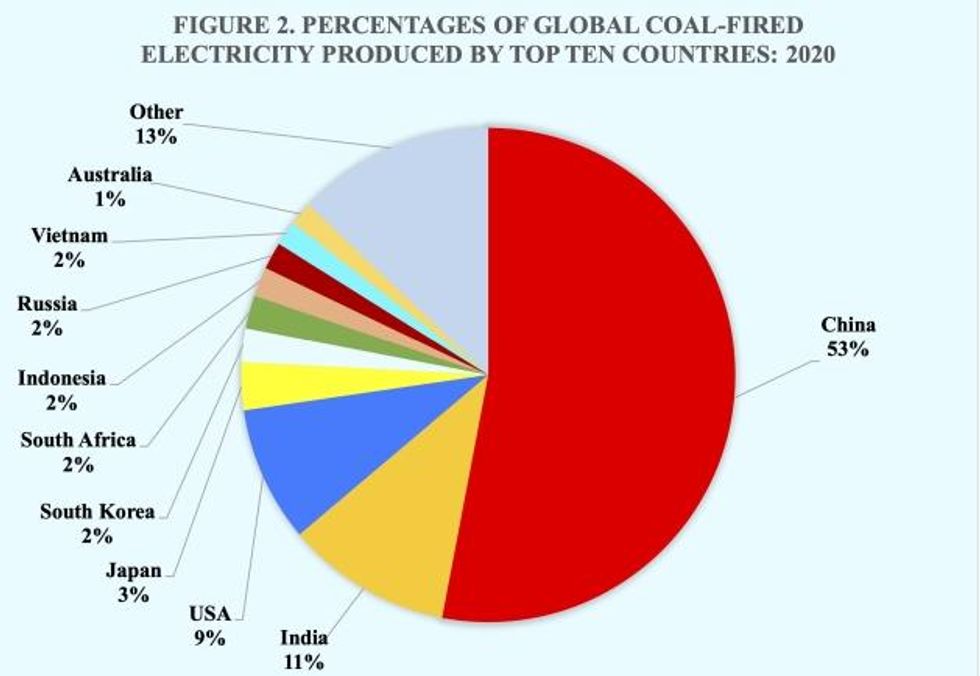 With its 1,110 coal-fired power stations, China alone accounted for approximately 53 percent of the world's coal-fired electricity in 2020 and those power stations provided 61 percent of China's electricity. Following China but at a considerably lower level is India, which is responsible for 14 percent of the world's coal-fired electricity with its coal-fired power stations providing 71 percent of India's electricity.