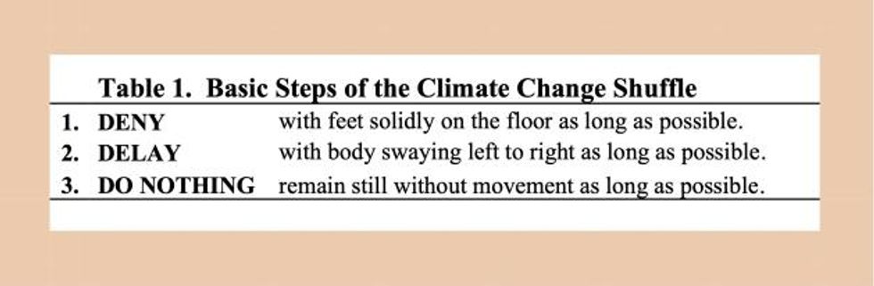 The third and final step in the Climate Change Shuffle, which should be performed effortlessly without movement, is to do nothing. Simply remain still, don't take any steps forward and let time slowly pass waltz by as long as possible. Climate change will likely soon be forgotten, displaced by something more immediate, such as gas prices, a sex scandal, or a military invasion.