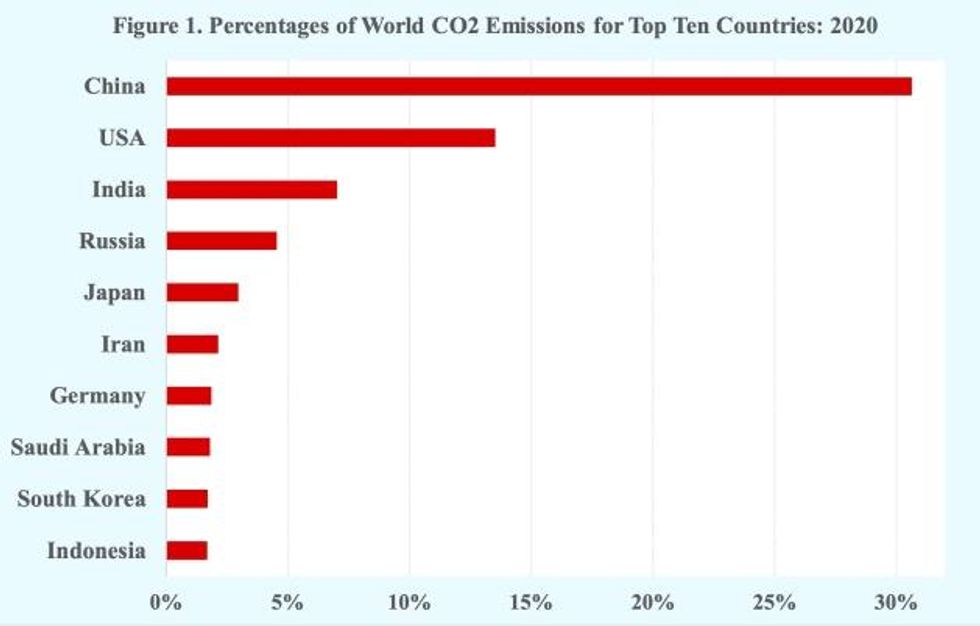 The top ten emitters of greenhouse gases account for two-thirds of the world's CO2 emissions. Far in first place is China, which is responsible for about 30 percent of the world's CO2 emissions. In a distant second place is the United States at 14 percent, followed by India at 7 percent and Russia at 5 percent (Figure 1).