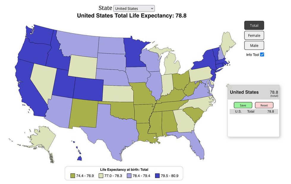 2019 Life Expectancy by State -- Source: National Center for Health Statistics of the Centers for Disease Control